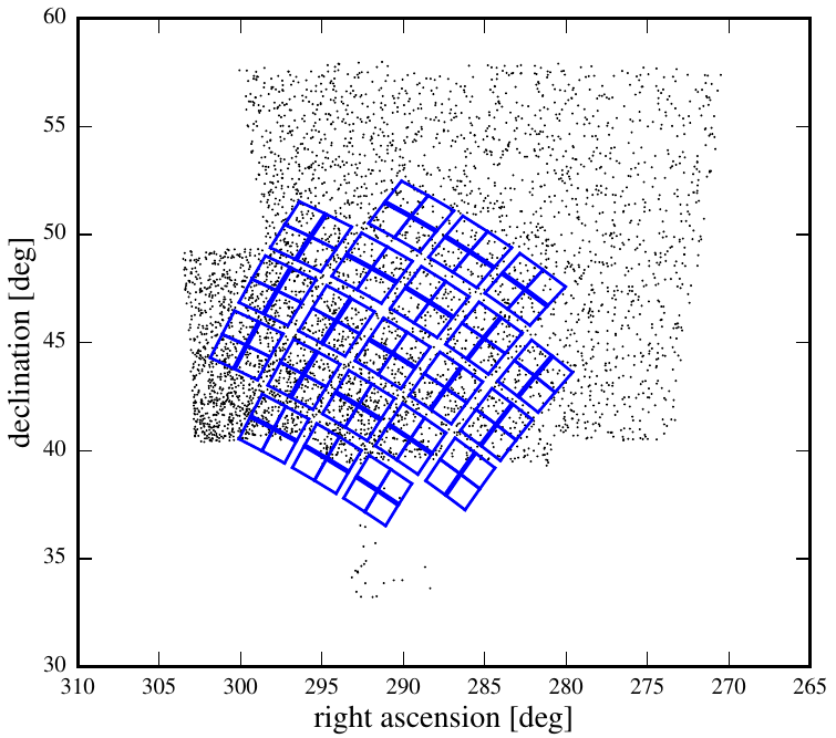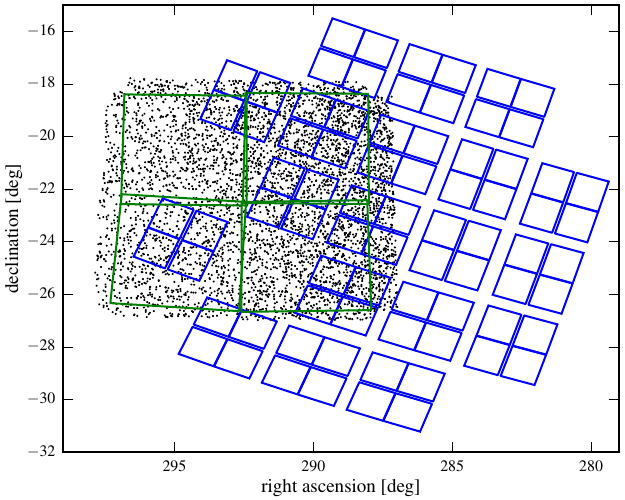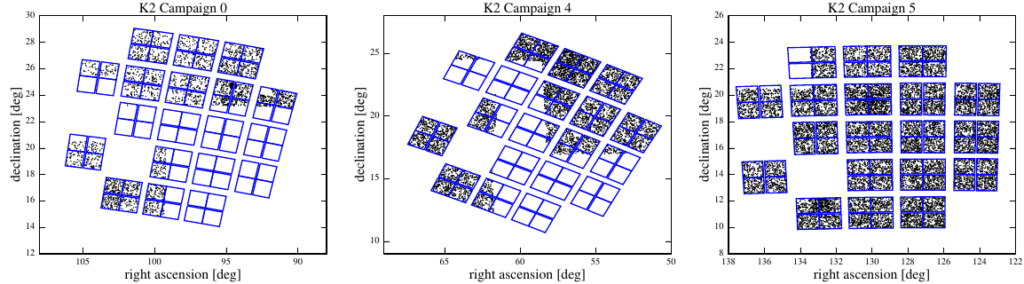 The figure below shows the overlap between three northern K2 fields and the HATNet survey. Fields of K2 Campaign 4 and 5 are especially interesting as they cover stars within the M67 and Hyades open clusters. Long term evolution of a large cohort of stars all (ostensibly) at the same age can be investigated most effectively by combining the HATNet and K2 light curves, allowing period searches and detection of secular trends over a much longer time base line.