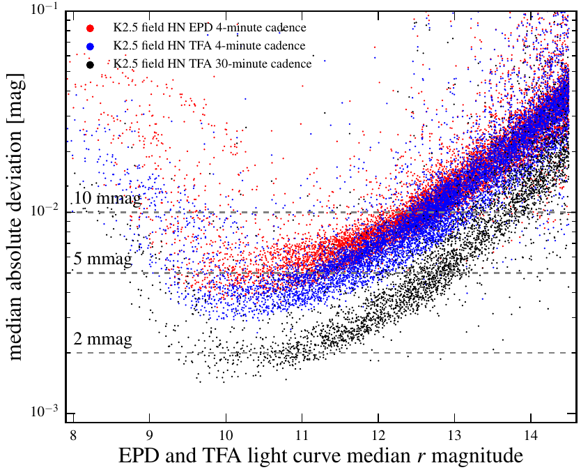 The left panel of the figure below shows the overlap between K2 observations of its Campaign 7 field which concide with HATSouth observations of a close-by field. The right panel of the figure shows the light curve precision in this field. Most notably, we are sensitive to variability to 2 magnitudes deeper than HATNet, allowing us to probe populations of redder and lower mass main-sequence stars.