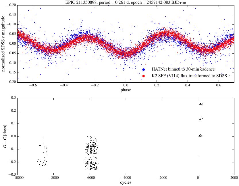 The figure below shows one example of the utility of the method outlined here. EPIC 211350898 is a contact eclipsing binary system matched between K2 and HATNet, with a combined light curve spanning nearly 10,000 orbital cycles (about 7 years). A secular change in the eclipse timing is easily seen over this range in time, perhaps indicating the presence of additional companions to this system.